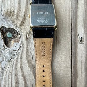 Love this watch but I had bought it hoping to swap out the leather band for a vegan leather band and it became too much to sort out. My loss is your gain! It has the classic Cartier tank watch look, black leather strap (240mm length), quartz movement, caliber 4N30, white dial and gold-tone stainless steel 28mm case. Would love for it to go to a new home where it will actually be worn.