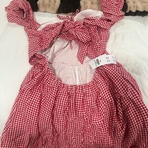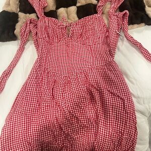 Charming red gingham mini dress. Features tie straps and a fitted bodice. Perfect for casual outings.