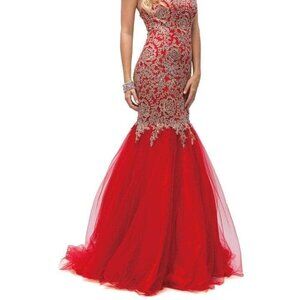 Attractive tulle gown with a beautiful beading pattern on the top and continuing before its mermaid skirt. Attributes a strapless mermaid neckline and a corset back and zipper back.