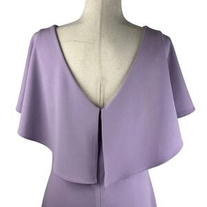 Belle Badgley Mischka sheath dress in a beautiful lavender purple hue. This elegant dress features a flattering V-neckline with a twisted detail at the bust and stylish flutter sleeves. The knee-length silhouette is perfect for a variety of occasions, from cocktail parties to professional events.