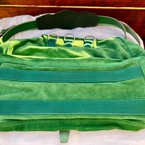Two outer cargo pockets, and main compartment flap with belted closure. Two way zipper closure with leather pulls. One inside pocket, adjustable shoulder strap with soft wool pad. Brass hardware. Compact/Mirror. Dust bag included!