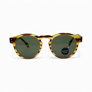 Stylish Komono sunglasses in a yellow tortoise pattern. Features green lenses for a chic look.