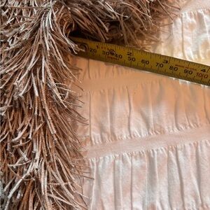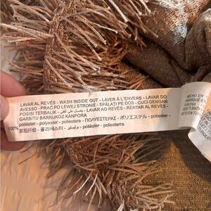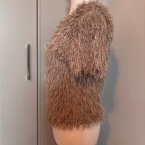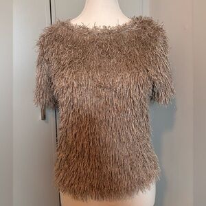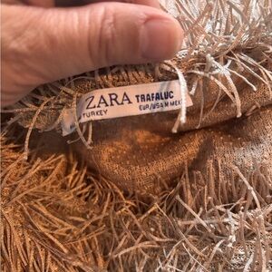 This fun Zara blouse features a boxy silhouette with short sleeves, crafted in a rich tan hue. The top is designed with a relaxed fit, making it a versatile addition to any wardrobe. The all over fringe adds a stylish design and is perfect for casual outings or a day at the office. Size Medium. Excellent like new condition. Fabric has a bit of a stretch.