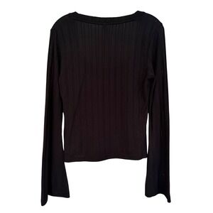Anthropologie Ribbed Bell Sleeve Scoop Neck Top Women's M Black Boho Hippie Y2K. The fine ribbing creates a flattering vertical line that elongates your frame, while the dramatic bell sleeves add a touch of bohemian flair. A versatile scoop neckline offers an elegant touch, making this piece perfect for layering or wearing on its own. Excellent, pre-owned condition. Ships from a non-smoking home.