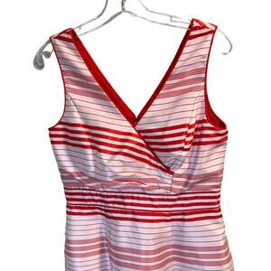 Details: Jessica Simpson, Red and White Stripe, Sleeveless, Fit and Flare, V-Neck Dress. This beautiful dress has a V-neck as well as V-back. Above knee length, Fitted bodice, and pockets. Well made, stripes line up nicely at seams.