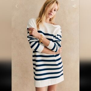 Sezane Briella Organic Cotton Dress in size small is a stylish sweater dress perfect for casual occasions during the winter and fall seasons. Made from soft knit cotton fabric, this dress features a high neck with a pullover closure and long sleeves, making it a cozy and comfortable option. The blue striped pattern adds a trendy touch to the short dress length, while the button accents add a subtle detail to the overall design. Ideal for a woman looking for a sustainable and fashionable addition to her wardrobe.