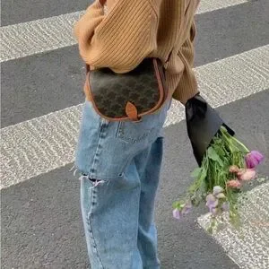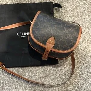 Brown Triomphe Canvas/Leather Folco Crossbody. Front fold-over flap with strap and buckle closure. Adjustable crossbody strap. Front exterior slip pocket. Textile-lined interior. Single interior wall slip pocket. Gold-tone hardware. Tonal stitching.