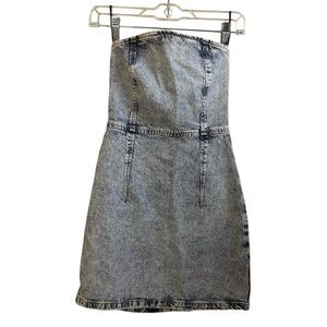 Stylish strapless denim dress. Perfect for casual outings. Features a fitted silhouette.
