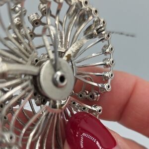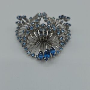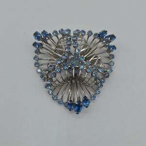 This stunning brooch features a captivating design with shimmering blue stones set in a sleek silver frame. Perfect for adding a touch of elegance to any outfit.