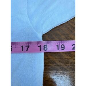 Pre-owned vintage shirt with overall light wear, wrinkling, and age-related fabric softness. White fabric shows faint discoloration and a few small marks on the front and back. Graphic print is intact with light cracking; collar and seams are secure with no holes or structural damage.