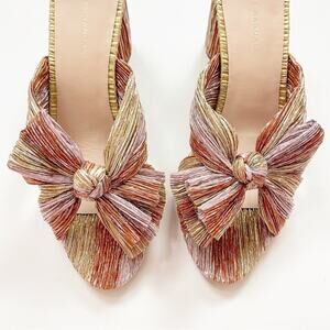 Pleated, heeled sandal in gold pink ginger striped fabric topped with a bow (rare, sold out colorway). Has a padded footbed with gold stamped logo. Open toe, slip on.