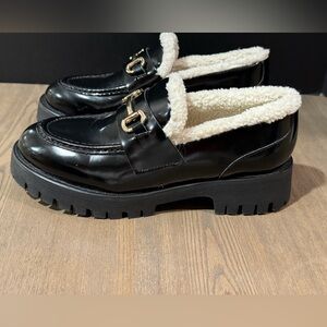 Steve Madden: Lando Fur: Platform Loafers: faux sterling: Step out in style with these chic black loafers featuring a cozy shearling lining. Chunky Lug Soke. Slip on style: gold tone horsebit hardware buckle. Perfect for any occasion, these shoes offer both comfort and elegance. Very nice clean shoe. Sole is hardly worn. Please see photos. RUNS SMALL