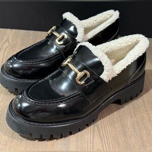 Steve Madden Women's Lando Black Loafers Faux Shearling Lining Chunky Sole 9M