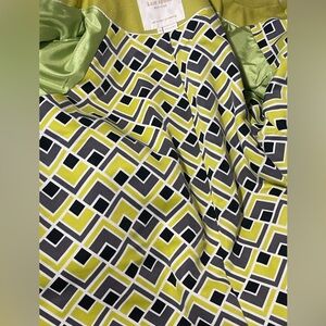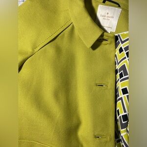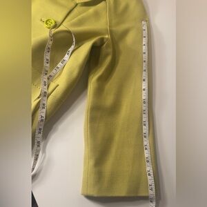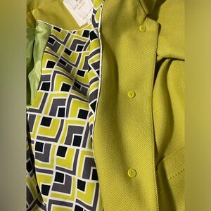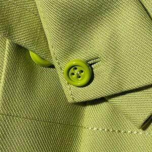 Elegant chartreuse cape jacket with button closure. Features wide sleeves and front pockets. Ideal for a chic look.