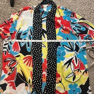 Colorful kimono style light jacket with bold patterns. Features a mix of polka dots and abstract designs. Excellent Condition