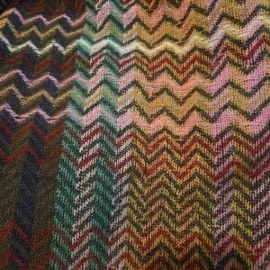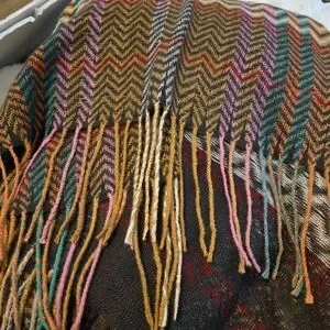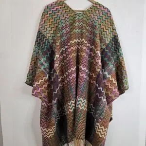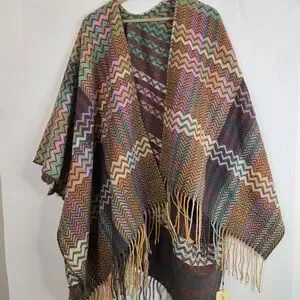Vibrant poncho with a chevron pattern. Features a mix of colors including pink, green, and brown with fringe accents. Add warmth & style to any outfit.