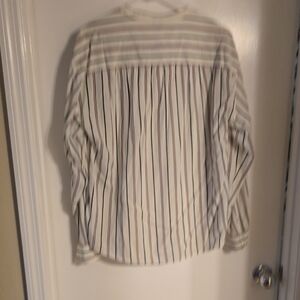 Elegant blouse with button-up design. Features vertical stripes and long sleeves.