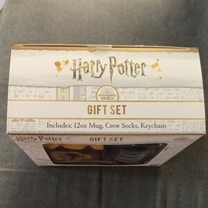 Hogwarts-themed gift set with a 12oz mug, Gryffindor socks, and a keychain. Ideal for fans.
