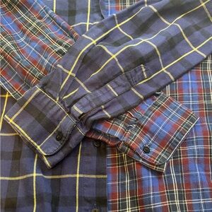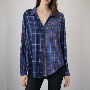 • Zara Woman Premium Denim Collection patchwork plaid button-down shirt.