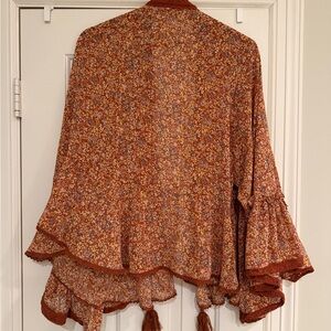 Gently loved Free People bohemian style kimono with floral pattern. Features tassels and flowing sleeves. Size small but super flowy and could fit up to a large. Smoke free home, no known flaws!