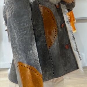 Colors: Light grey with a tan cognac patchwork with stitching and tan buttons