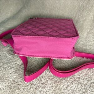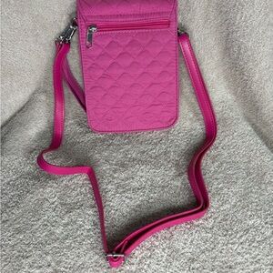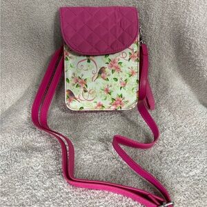 Cute and functional Willabee & Ward crossbody bag for phone or wallet from The Danbury Mint. This bag has a pink quilted flap with floral and bird patterns on the front, set against a white background. The interior is also pink. Compact size is perfect for carrying your phone, cards, and small essentials.