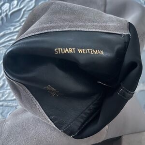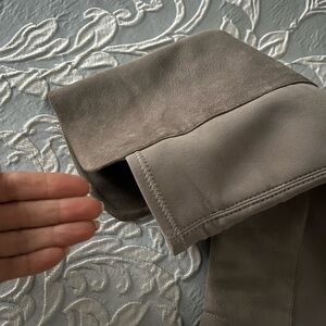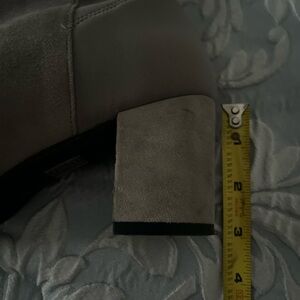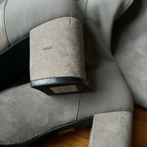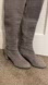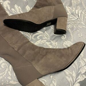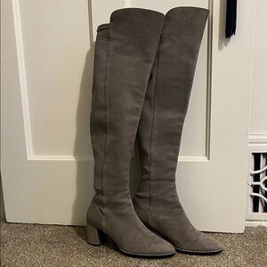 Chic gray at-the-knee boots all season - elevates this riding boot style with the heel - suede is so lux. Comfort and sophistication. minor markings that heel - see photos. Elastic back, eases your leg in and out of these boots without a zipper -extremely comfortable!
