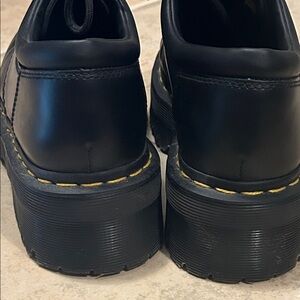Stylish black leather platform shoes with lace-up design. Features yellow stitching detail.