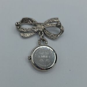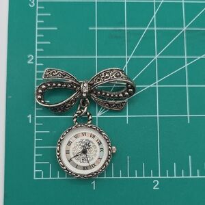 Elegant silver brooch with a detailed bow. Features a decorative clock pendant. Perfect for adding sophistication.