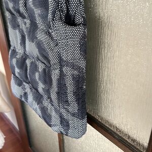 Cute black and white patterned puffer hooded vest with front pocket. Measuring 18” flat on chest