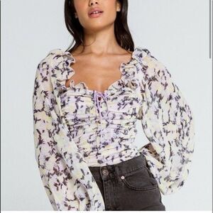 Free People Mabel Floral Tie Blouse Lilac Balloon Sleeve Sz S Boho Cottage