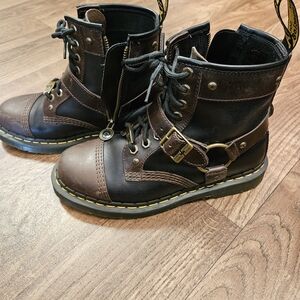 From Dr. Martens Mad Max collection, 1460 boot with harness. Bronze metals with black/brown leather mix. Worn once and had a difficult time fitting it with my current style so decided it's time to get them out of the closet. Fits womens 8