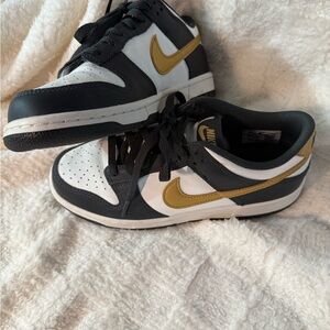 Chic Nike sneakers for kids. Black and white with a bold gold swoosh. Ideal for daily adventures.