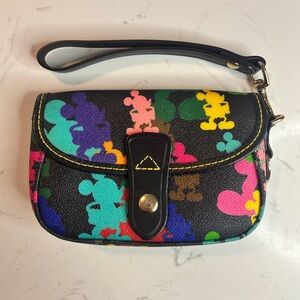 Rare Disney Dooney & Bourke multicolor Mickey silhouette wristlet in like new exterior condition.