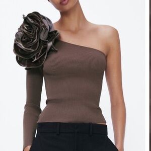 *NWT* Zara Mink Asymmetric Knit Top with a velvet floral detail on the shoulder