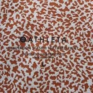 Stylish Athleta Salutation Stash leggings featuring a beautiful rust/orange speckled print on a soft neutral background. Designed with a flattering high-rise waistband and ultra-soft, supportive fabric for comfort and performance. Includes convenient side stash pockets on each leg—perfect for phone, keys, or cards. Ideal for yoga, gym, running, travel, or everyday athleisure wear.