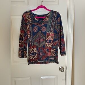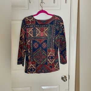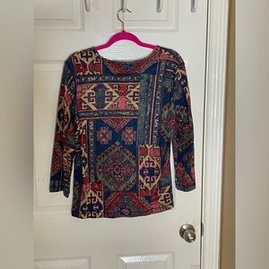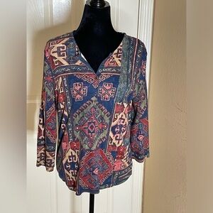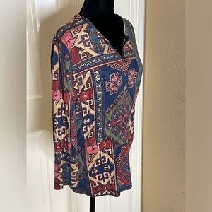 Machine washable for easy care, this multicolor shirt is sure to turn heads with its Aztec theme and button accents. Perfect for any occasion, this pre-owned shirt is a must-have for any fashion-savvy woman. Don't miss out on this stylish addition to your wardrobe.
