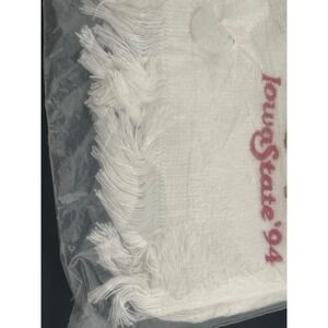 Celebrate your Cyclone pride with this vintage Iowa State University collectible. This charming white rally towel features the iconic Cy the Cardinal mascot in a playful pose, proudly displaying "Iowa State '94" embroidery. Fringed edges add a touch of classic flair to this spirited piece, perfect for showcasing your alma mater's legacy. Ideal for game days, alumni events, or as a unique decorative accent to your fan cave.