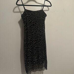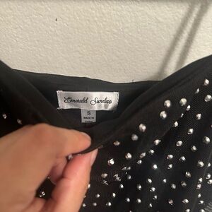 Elegant black dress adorned with shimmering silver accents. Perfect for evening wear.
