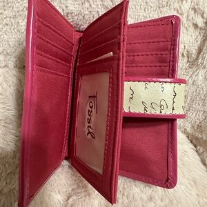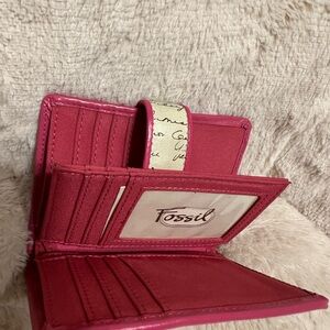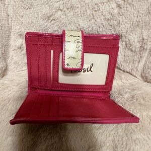 Stylish Fossil wallet with heart accents. Pink and cream design. Perfect for adding charm to your look.
