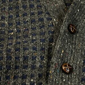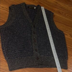 Stylish knit vest in gray and blue. Features a button-up front. In absolute perfect condition. No shrinkage, heathered details, dark navy and gray. Men’s size large.
