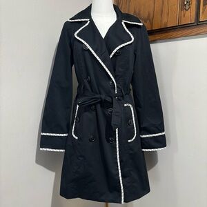 Merona Black Trench Coat White Trim Notched Lapels Waist Tie Size Small