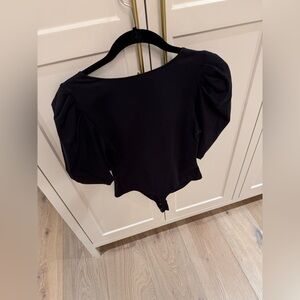 This elegant black body suit features stylish puff sleeves and a deep V-neckline, perfect for any occasion.