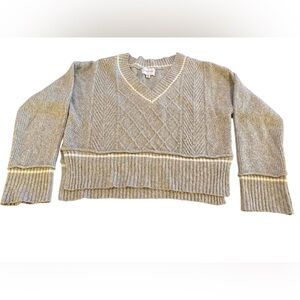 Super cozy Pink Rose gray knit sweater with a flattering V-neck and beautiful textured pattern throughout. Ribbed hem and cuffs give it a comfy, slightly structured fit. Perfect for fall and winter layering.