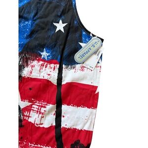 Keywords: US Apparel, patriotic, USA flag, tropical, palm tree, graphic tee, summer, 4th of July, beachwear, casual, festive, Americana, sleeveless