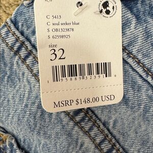 Stylish blue distressed jeans with unique patchwork design. Perfect for a casual, trendy look.