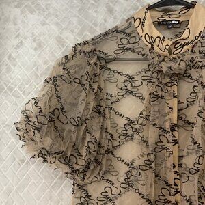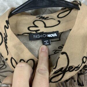 Fashion Nova Womens M Sheer Button Up Shirt Tan Brown Puff Sleeve Tie Neck. This shirt says "eyes on me" all over in velvet lettering. This shirt needs to be worn with a cami tank top underneath. No stains or holes.