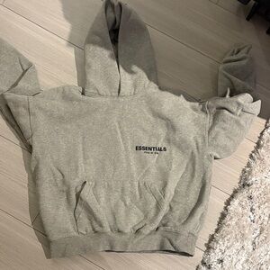 Soft heather gray pullover with front pocket. Features Essentials logo on chest.