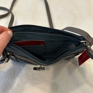 NWT. Chic dark teal crossbody bag with adjustable strap. Ideal for daily wear. Features front zip pocket.