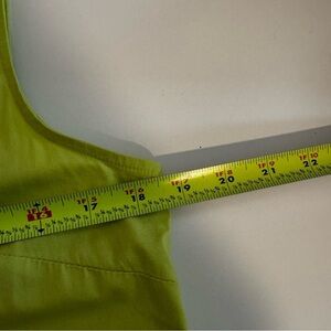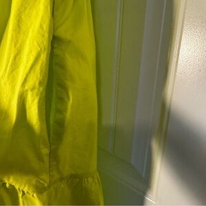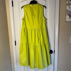 Vibrant lime green sleeveless dress with tiered design with mini ruffled v-neck, hi-low shirt, zippered back and pockets. Perfect for a casual day out.